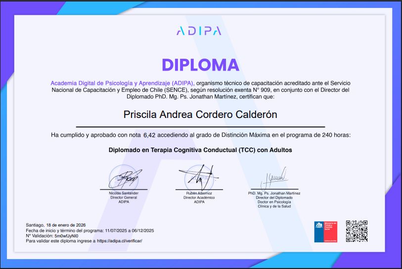 - Psicóloga con 14 años de experiencia, me desempeñé en el Centro de Salud Mental (CESAM San Joaquín), donde brindé atención a pacientes con diferentes trastornos de personalidad, tales como Depresión, Trastorno Bipolar, Bulimia, y otras problemáticas de mayor complejidad, participando en procesos de evaluación, acompañamiento y apoyo terapéutico. Esta experiencia me permitió desarrollar habilidades para abordar el malestar psicológico desde una mirada integral, considerando la historia y contexto de cada persona. Adicionalmente, cuento con experiencia en el ámbito de la psicología laboral/organizacional, lo que me ha permitido comprender de mejor manera problemáticas relacionadas con estrés, exigencia, crisis laborales y dificultades en el equilibrio entre la vida personal y el trabajo. Actualmente, continúo fortaleciendo mi formación en el área clínica, poseo un Diplomado en Terapia Cognitivo-Conductual y actualmente estoy cursando un Diplomado en neurociencias, integrando estos conocimientos en mi práctica profesional.